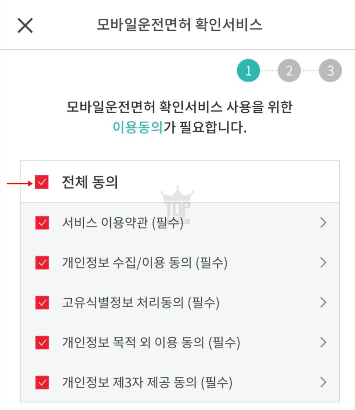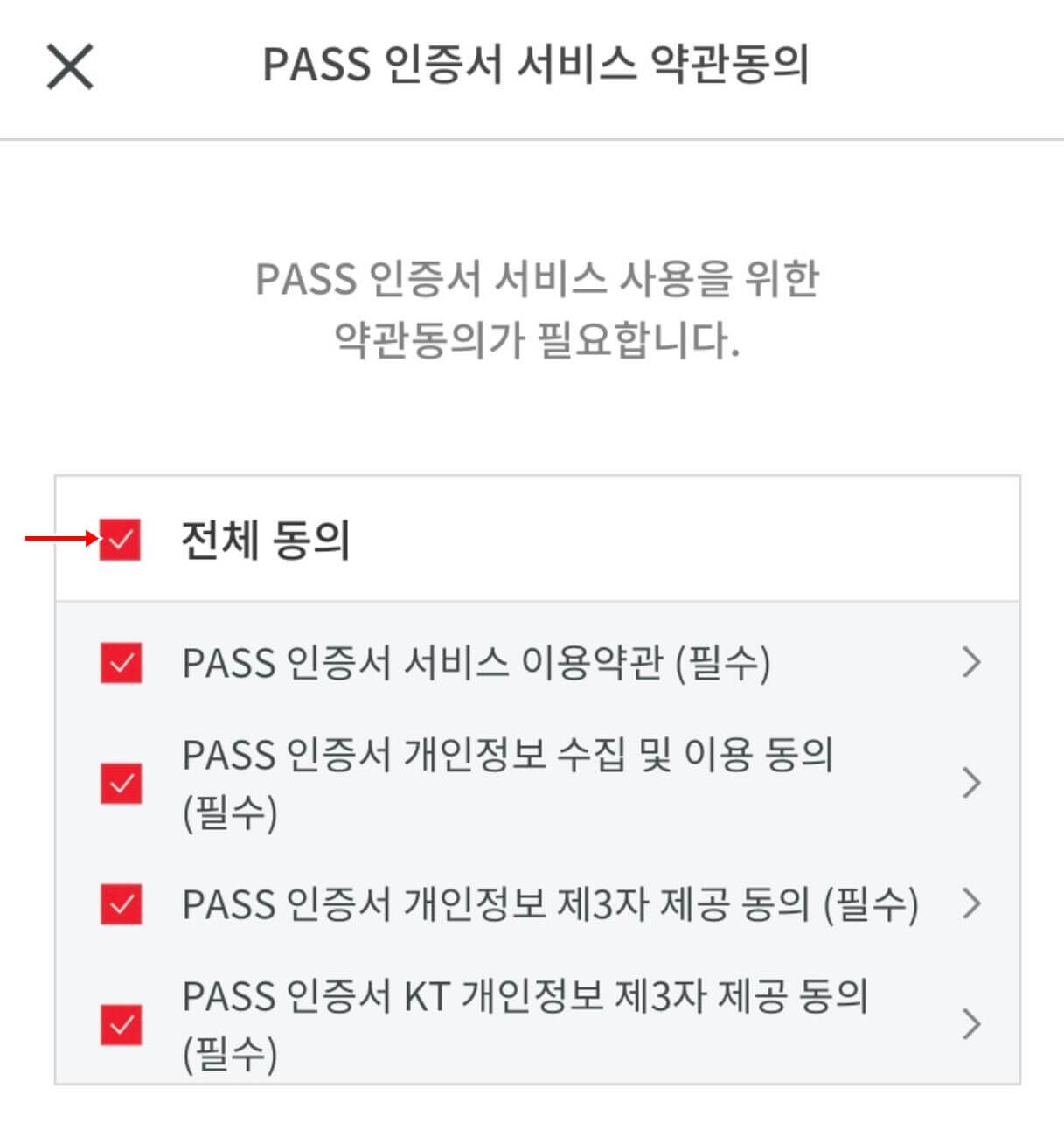 6. PASS 인증서 서비스 약관동의에 체크를 해주시면 PASS앱 인증서 발급은 모두 끝이 나게 됩니다.